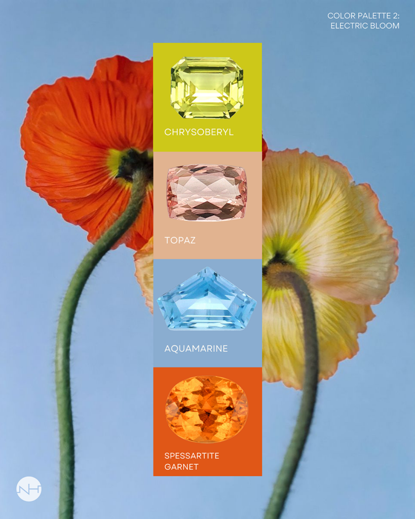 A more directional approach to color-forward design is using multiple gemstones in a single composition, with a diamond acting as a point of separation and refinement.